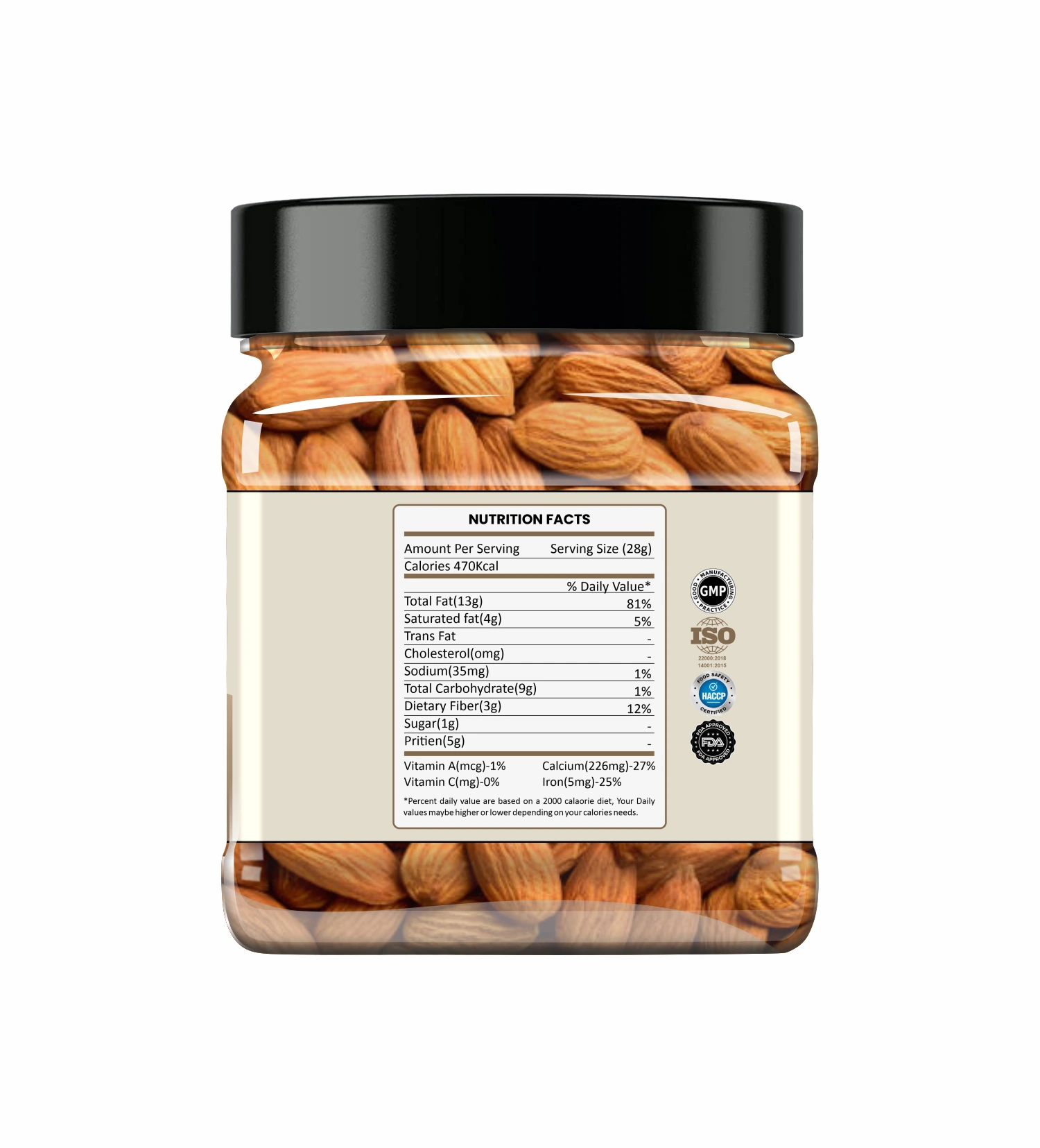 Crunchy, premium-quality almonds roasted to perfection and seasoned with just the right amount of salt. Rich in Vitamin E, healthy fats, and protein — these almonds are your perfect go-to snack for energy and wellness.