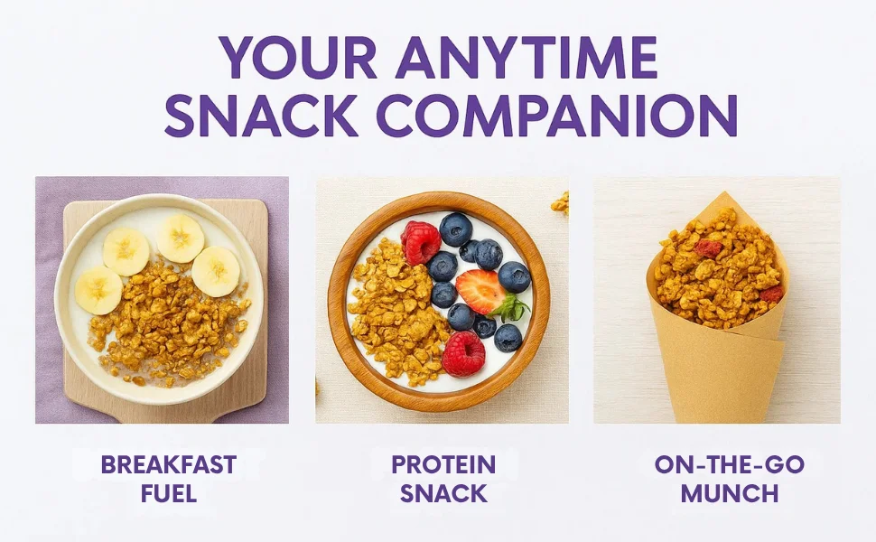 A wholesome mix of rolled oats, seeds, honey, and premium dry fruits. This granola delivers natural energy, crunchy texture, and nourishment in every spoonful. Ideal for breakfast or mid-day snacking.