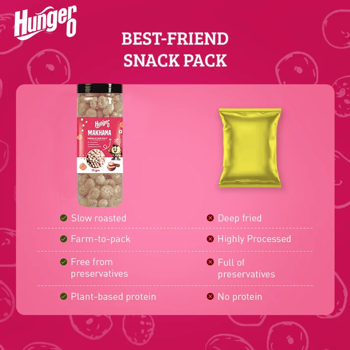 Pure, simple, and absolutely delicious. Hunger Zero’s Himalayan Salt Makhana is roasted with minimal seasoning to retain the authentic crunch of premium fox nuts. A clean snack for those who prefer subtle, natural flavours with maximum health benefits.